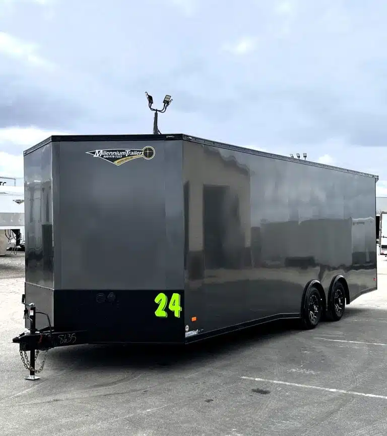 2025 24′ Millennium Blaze Enclosed Car Hauler V-Nose Front .030 Charcoal Bonded Exterior w/Black Trim Black-Out Package 2/5,200 Torsion Axles Aluminum Wheels 7 ft. Approx. Interior Height Heavy…